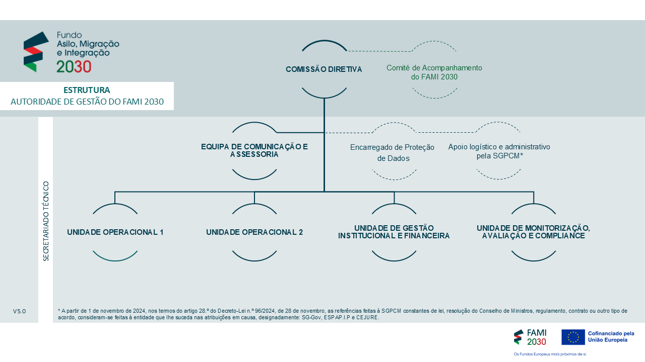 A Autoridade de Gestão do Programa FAMI 2030 assenta numa estrutura de missão que integra os seguintes órgãos: i) comissão diretiva; ii) secretariado técnico, conforme disposto no artigo 14.º conjugado com o n.º 3 do artigo 49.º do Decreto-Lei n.º 5/2023, e 25 de janeiro, na sua redação atual.